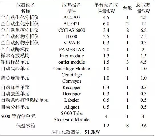 檢驗科內(nèi)常用的儀器有生化分析儀、免疫分析儀、藥物分析儀、酶標(biāo)儀、特種蛋白分析儀、離心機、低溫冰箱等。常用檢驗設(shè)備發(fā)熱量統(tǒng)計見表2。
